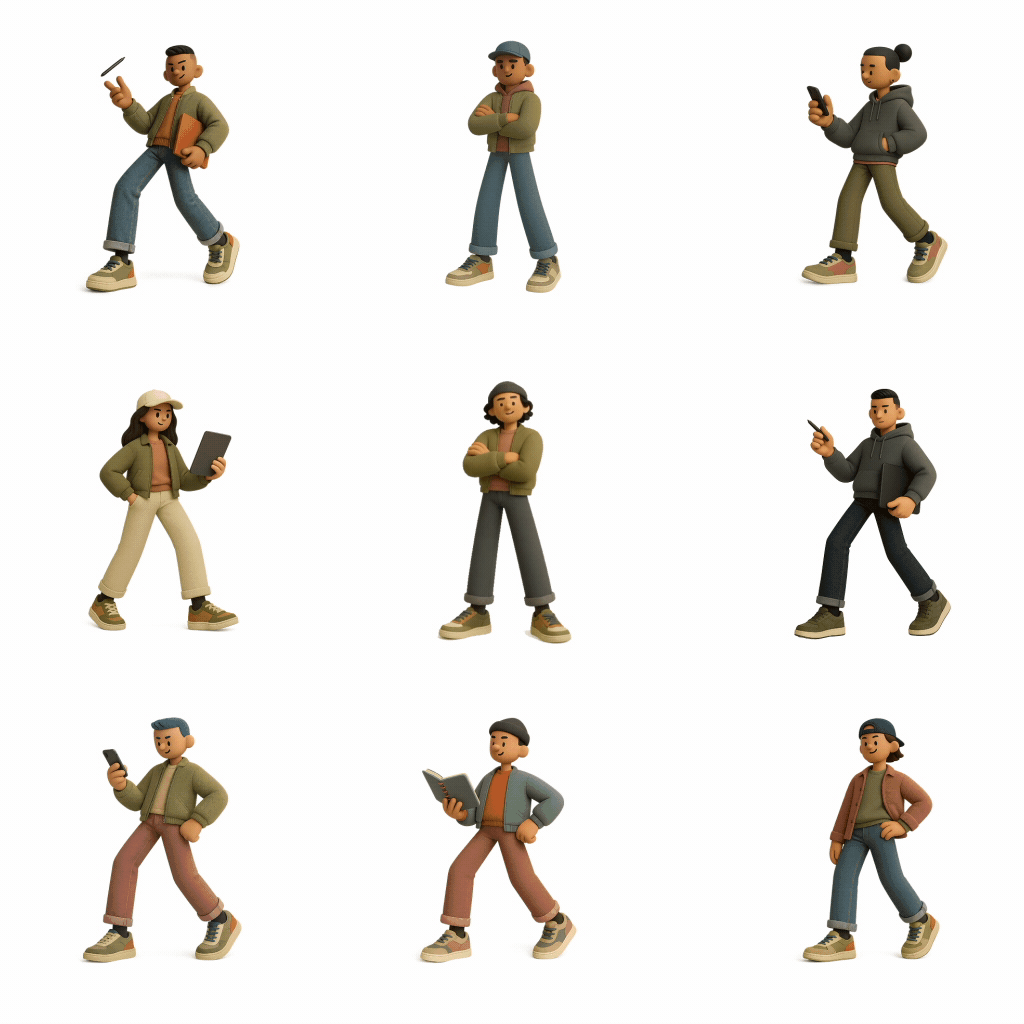 character_prompt_profile: { "theme": "Creative Agency Professionals — Stylised Streetwear", "character_design": { "role": "Motion Designer", "action_or_props": "Tossing a stylus with one hand, holding a sketchpad under the other arm", "mood": "Playful, confident, relaxed", "expression": "Subtle grin", "head_style": "Tiny cartoon-style head — 8% of body height, smooth and round with minimal facial features", "eye_style": "Small 3D cartoon-style eyes — uniform, textureless, black", "hand_style": "Minimal cartoon-style hands — smooth, round, no visible joints or fingers", "hair_style": "Short fade with side part" }, "art_style_profile": { "style_name": "Stylised 3D — Cinema 4D Octane Streetwear", "visual_elements": { "shape_language": "Head and torso = 20%, Legs and feet = 80%", "colors": { "primary_palette": ["Muted olive", "Warm taupe", "Faded denim", "Cream"], "accent_colors": ["Burnt orange", "Desaturated teal"], "shading": "Soft PBR-based shading with subtle gradients" }, "lighting": { "type": "Softbox-style studio lighting", "source_direction": "Frontal key with soft back rim", "shadow_style": "Soft-edged contact shadows", "color_temperature": "5500K", "exposure": "Clean and bright" }, "materials": { "surface_texture": "Realistic fabrics like fleece and denim with visible grain and folds", "reflectivity": "Matte finish with slight sheen on nylon" }, "composition": { "object_presentation": "Full-body character in ¾ pose", "perspective": "Low angle to emphasize leg length", "background": "Transparent PNG" }, "rendering_style": { "technique": "Cinema 4D with Octane", "detail_level": "High realism on clothing and textures; simple cartoon-style face and hands" } }, "purpose": "To generate a cohesive series of stylised agency characters for use in branding and editorial illustration" } }